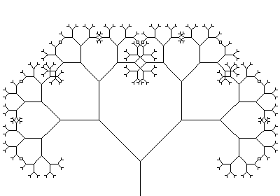 to treefrac :x if :x<2 [stop] fd :x lt 45 fd :x treefrac 2*:x/3 ;A "mini-tree" growing at the tip of the Y. bk :x rt 90 fd :x treefrac 2*:x/3 bk :x lt 45 bk :x End |